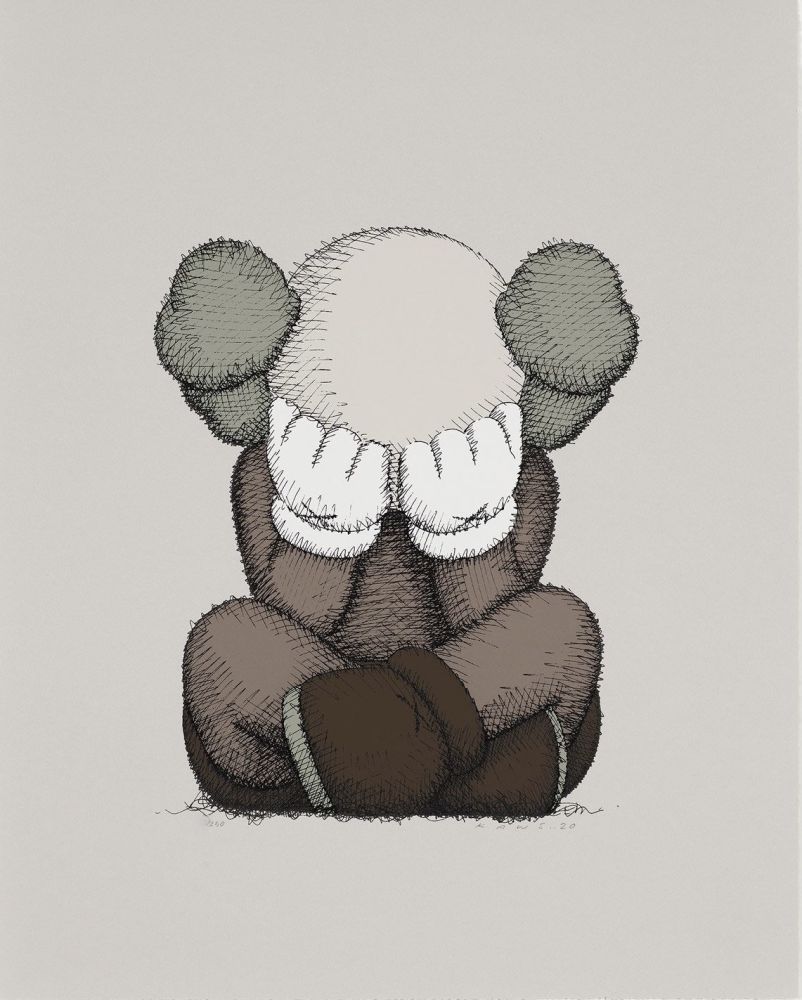 Le « Companion » de Kaws est une figure de clown en nuances de gris qui s’inspire de Mickey Mouse, arborant un masque formé par ses deux mains et deux os émergeant de sa tête. Les sculptures de Kaws sont fabriquées à partir de divers matériaux, notamment de la fibre de verre, de l’aluminium, du bois, du bronze et même d’un radeau gonflable en acier.