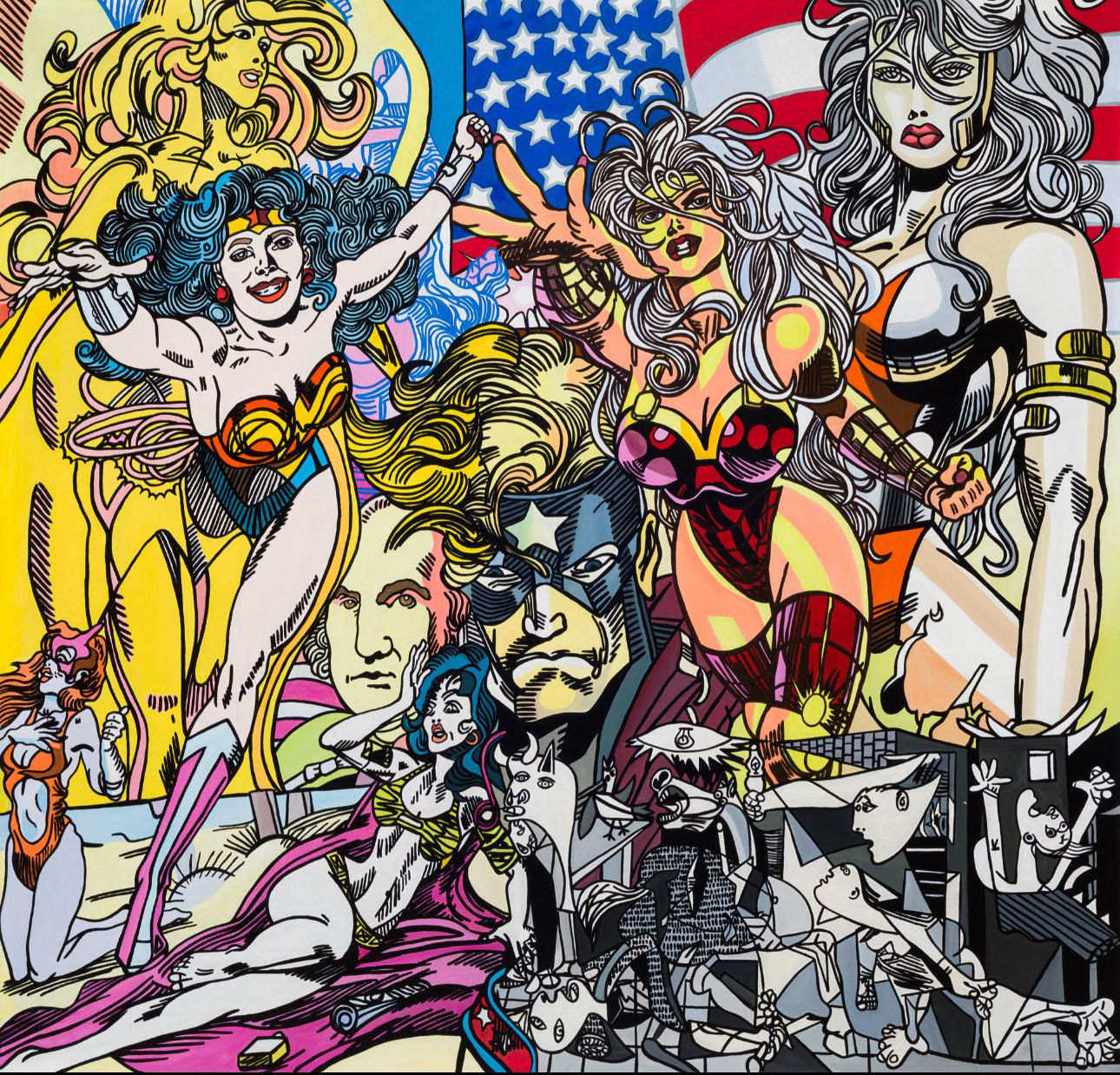 Erró évolue dans un univers digne d’une bande dessinée, où des personnages de dessins animés côtoient des despotes historiques. Il puise constamment son inspiration visuelle dans les journaux, la publicité et l’illustration pour créer ses collages, mélangeant des échantillons culturels provenant du monde entier. Ainsi, des héros de Walt Disney peuvent se retrouver aux côtés de dictateurs sur une même toile.