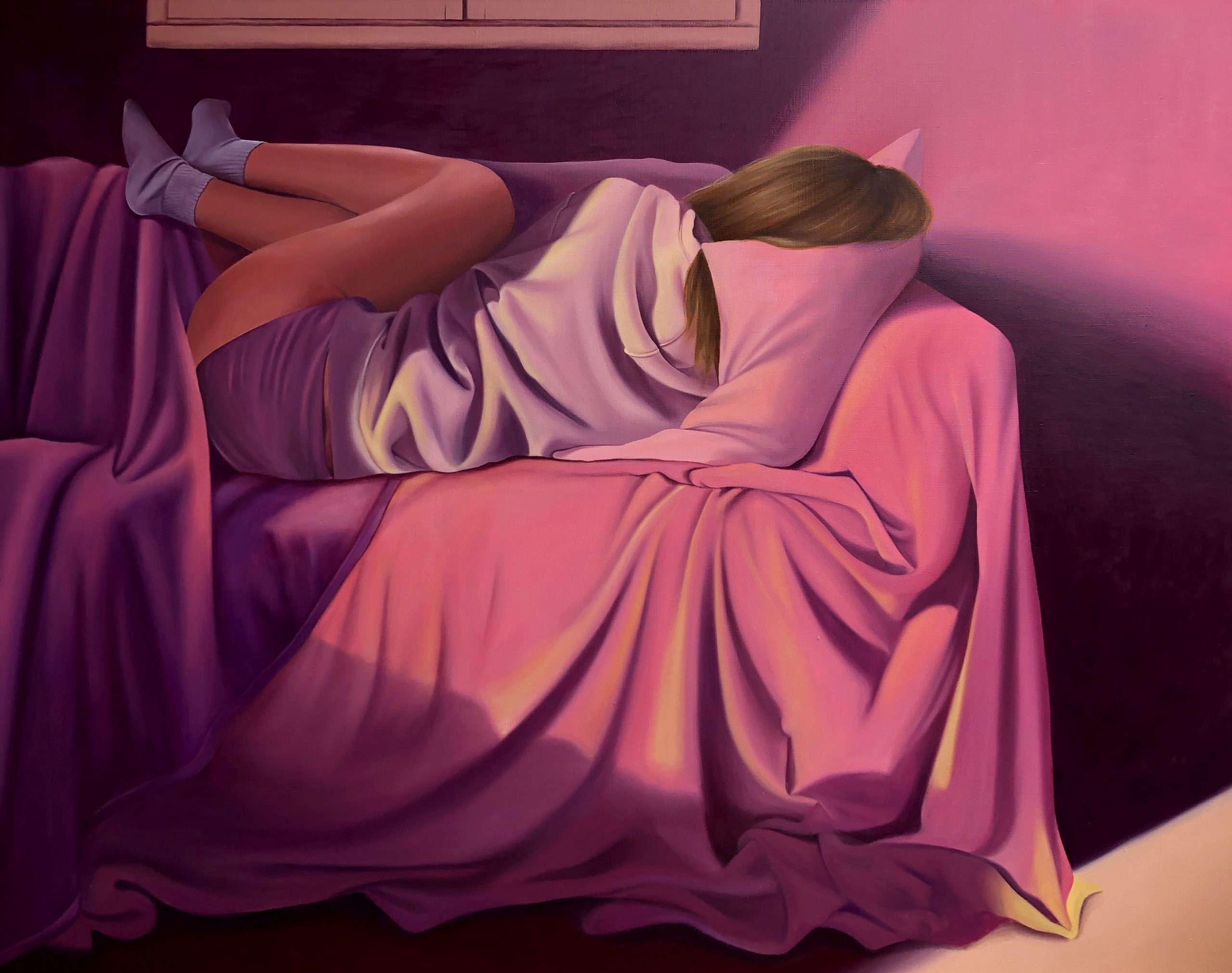 Soraya Dagman propose une interprétation contemporaine du quotidien, où le réalisme s’enrichit d’une dimension onirique. Ses œuvres, tout comme celles de Schlosser, explorent la notion de cadre, mais avec une esthétique qui flirte avec le surréalisme. En utilisant des couleurs vives et saturées, telles que le magenta, et en intégrant des éléments de la culture populaire contemporaine, elle interroge notre perception de la banalité quotidienne. Ses toiles, imprégnées de références à des marques connues, offrent une réflexion sur les symboles de notre époque, tout en suggérant une vision presque rêveuse de la réalité.