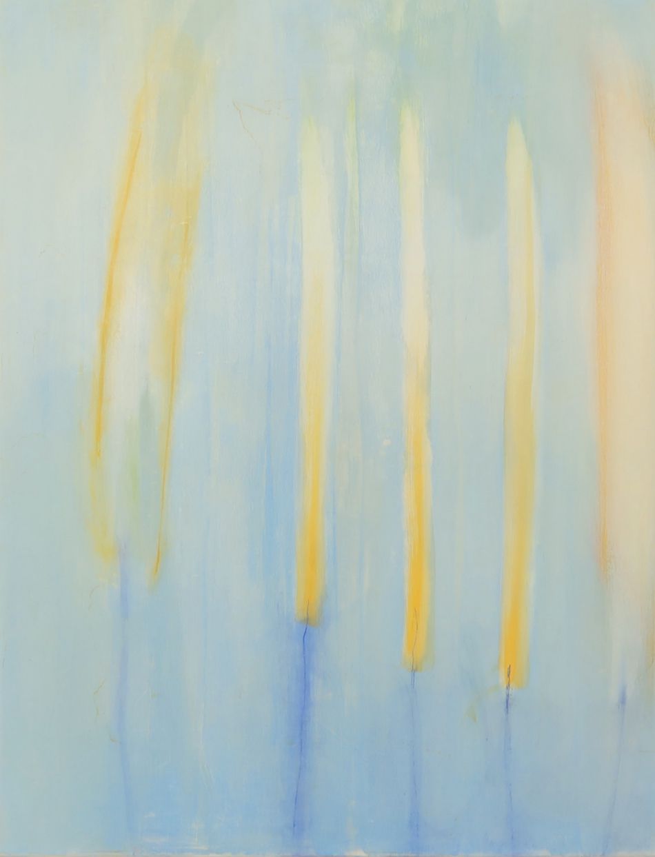 Les œuvres d’Anastasia Carvalho se font d’allers et retours entre les temps et les surfaces. Préparées avec soin, les toiles sont apprêtées à la colle de peau et à la poudre de marbre, ce qui leur donne un aspect presque minéral. Le médium devient lisse, poreux, et la toile émerge parfois à force de ponçage.