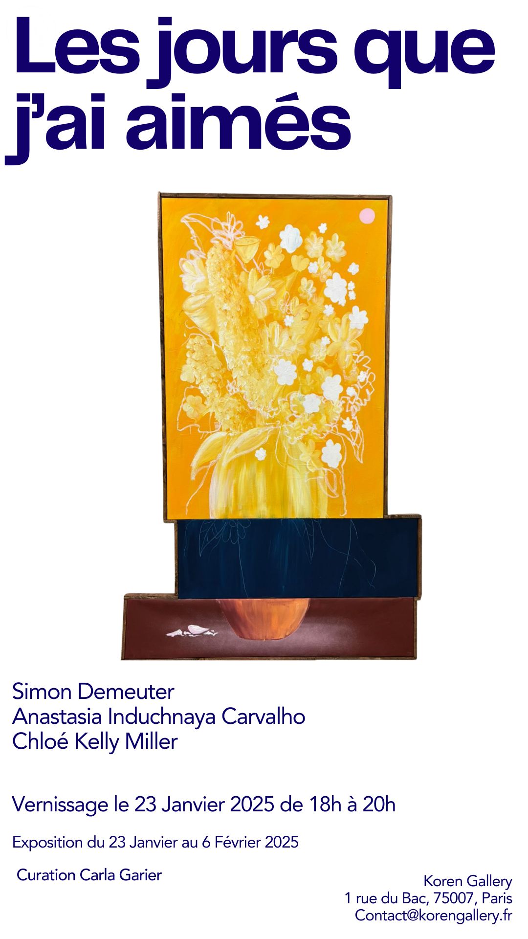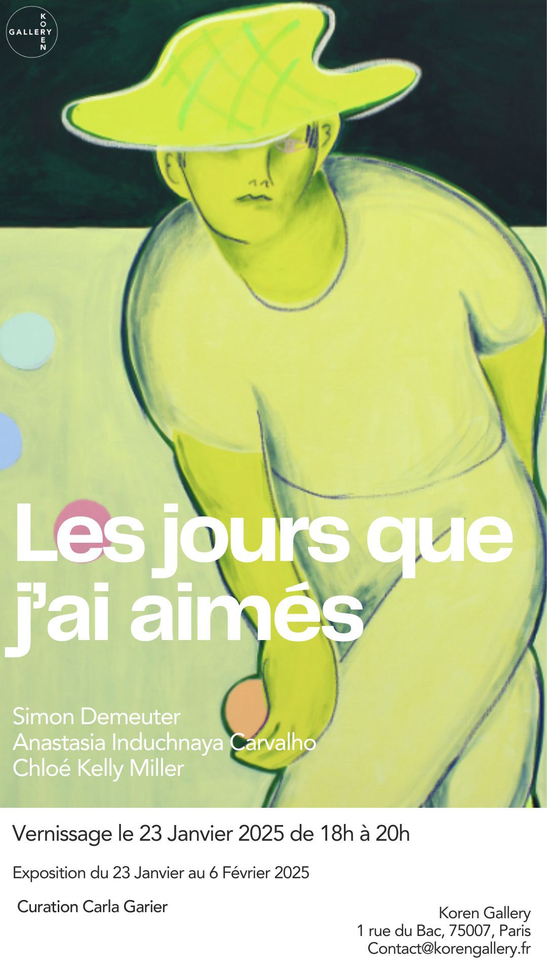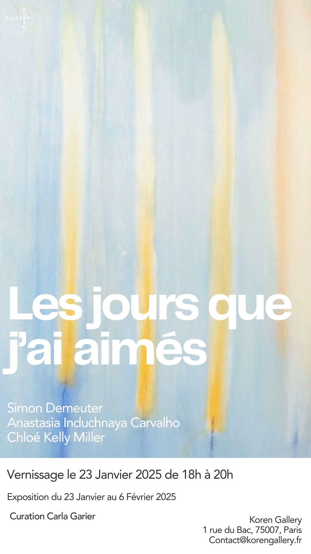 La Koren Gallery est ravie de vous présenter la prochaine exposition Les jours que j’ai aimés, en collaboration avec la Curation Carla Garier. L’exposition, sous forme de Group Show, représentera les artistes Simon Demeuter, Anastasia Induchnaya Carvalho et Chloé Kelly Miller, du 23 Janvier au 6 Février 2025.